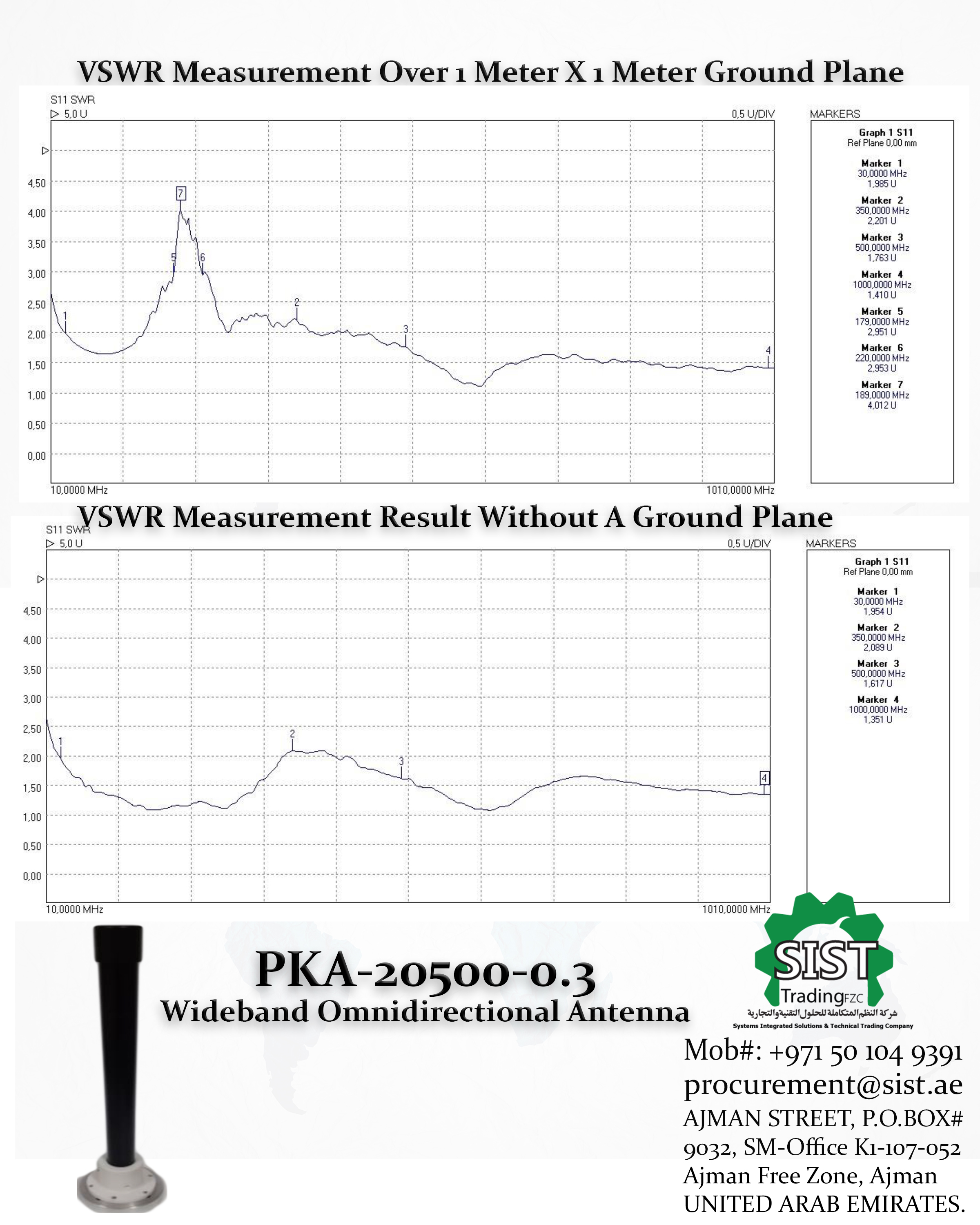 Over 1X1 m2Ground Plane: 30-500 MHz Without a Ground Plane 20-500 MHz ≤ 2.5:1 |